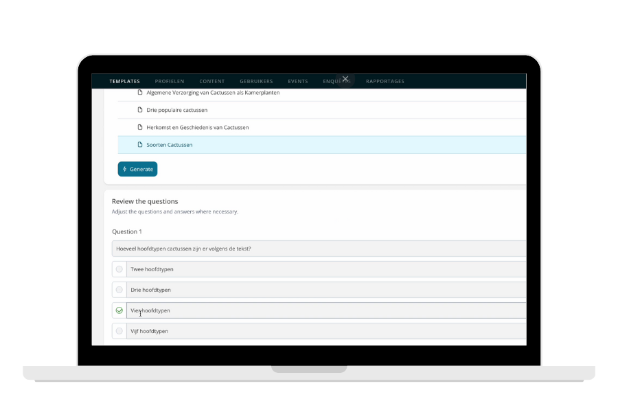 Om je een handje te helpen, hebben we de handige AI vragengenerator aan ons platform toegevoegd. Deze tool helpt je bij het genereren van meerkeuzevragen en antwoorden (verzin maar eens een goed fout antwoord, zo makkelijk is dat niet!).