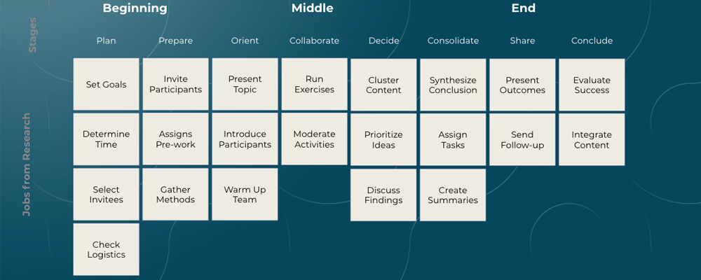 Omdat hij bij Mural (software om workshops mee te faciliteren) werkt, gebruikt hij in zijn boek het voorbeeld van een Job map voor een workshop facilitator die dus een workshop gaat geven. Dat komt al een klein beetje in de buurt van een training geven dus ik neem het voorbeeld even over. Een Job map is daarbij altijd chronologisch. Er is dus een begin, een midden en een eindpunt.
